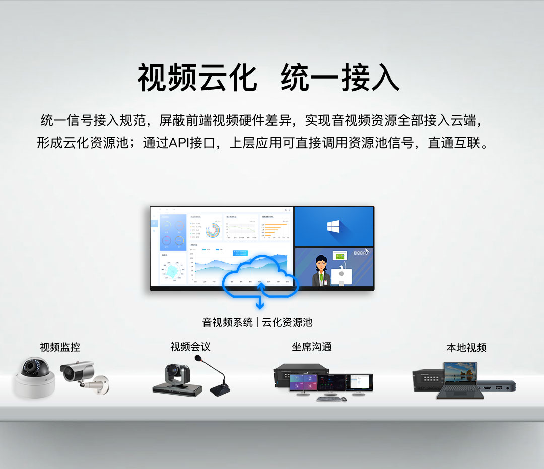 屏蔽前端視頻硬件差異,實(shí)現(xiàn)音視頻資源便捷接入云端,形成云化資源池; 通過(guò)API接口,上層應(yīng)用可直接調(diào)用資源池信號(hào),直通互聯(lián)。