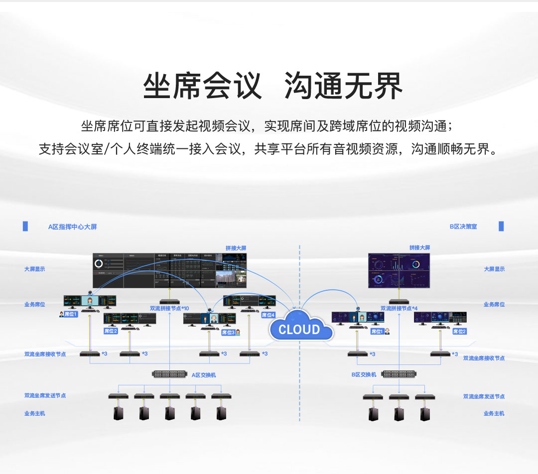 坐席席位可直接發(fā)起視頻會(huì)議,實(shí)現(xiàn)席間及跨域席位的視頻溝通;支持會(huì)議室/個(gè)人終端統(tǒng)一接入會(huì)議,共享平臺(tái)音視頻資源,實(shí)現(xiàn)順暢溝通。