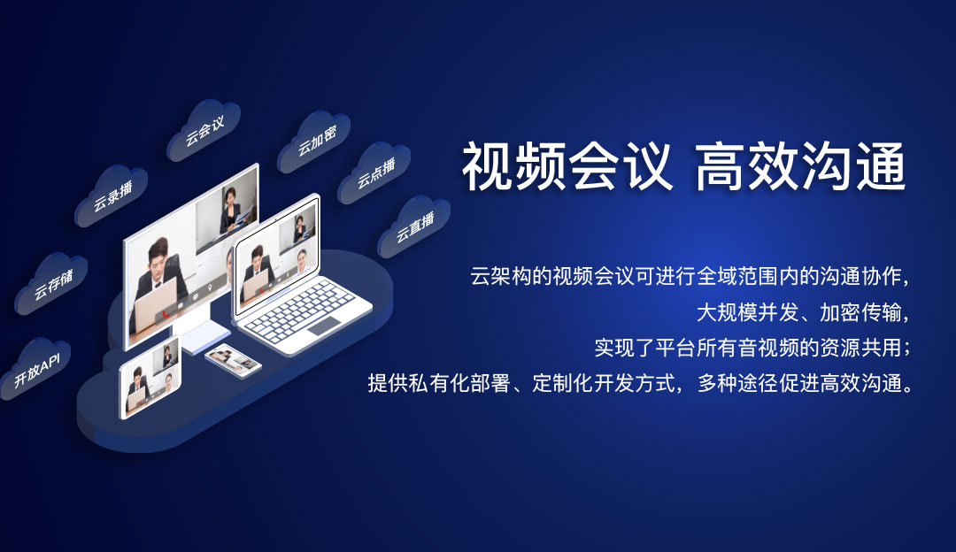云架構(gòu)的視頻會(huì)議可進(jìn)行全域范圍內(nèi)的溝通協(xié)作,大規(guī)模并發(fā)、加密傳輸,實(shí)現(xiàn)了平臺(tái)音視頻的資源共用; 提供私有化部署、定制化開(kāi)發(fā)方式,多種途徑促進(jìn)高效溝通。