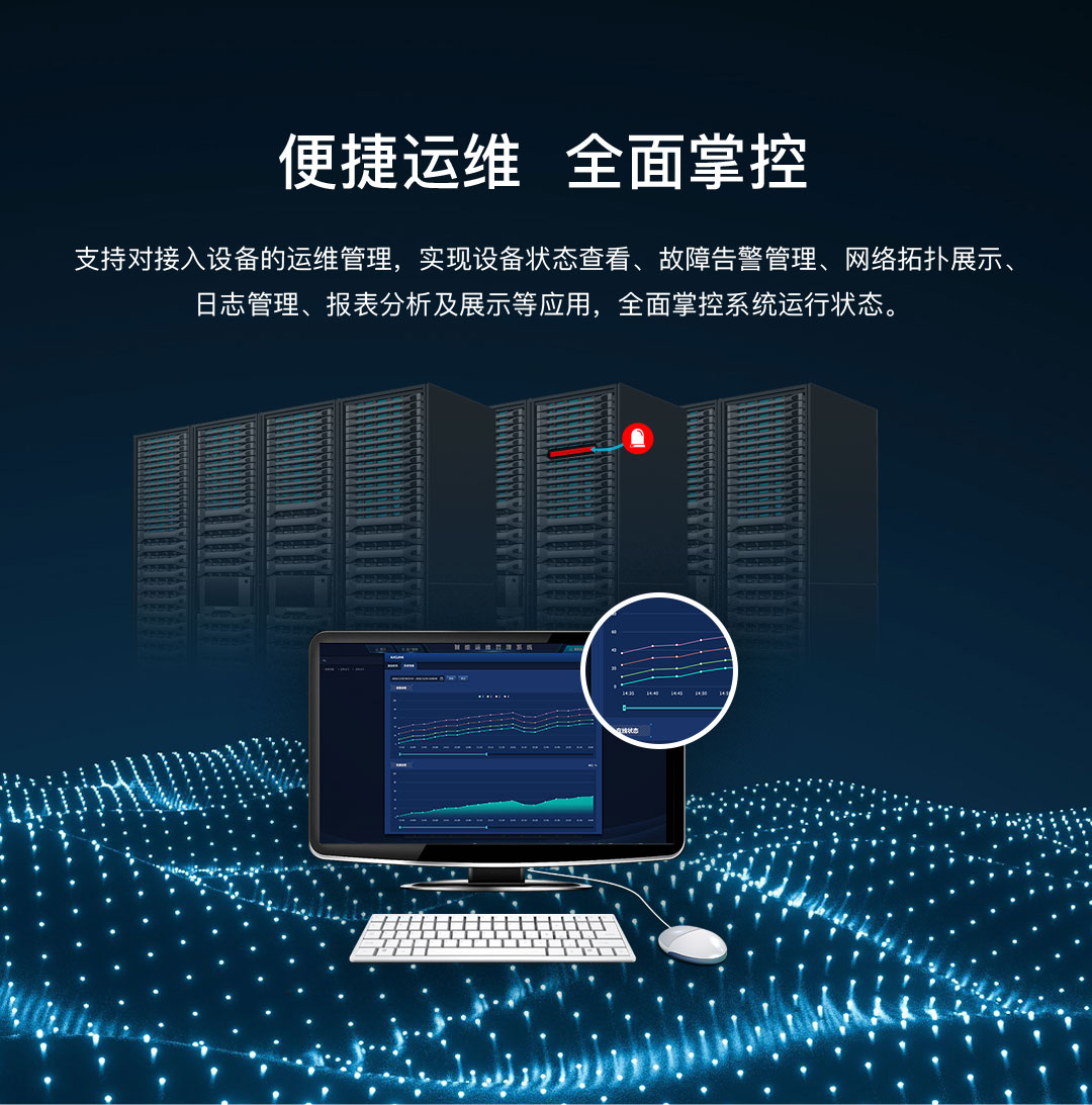 支持對(duì)接入設(shè)備的運(yùn)維管理,實(shí)現(xiàn)設(shè)備狀態(tài)查看、故障告警管理、網(wǎng)絡(luò)拓?fù)湔故尽⑷罩竟芾怼?bào)表分析及展示等應(yīng)用,掌控系統(tǒng)運(yùn)行狀態(tài)。