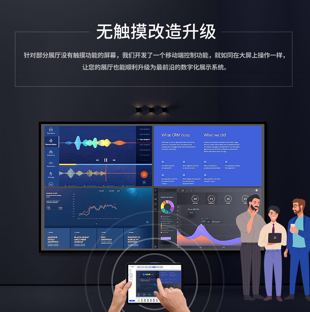 針對(duì)部分展廳沒有觸摸功能的屏幕,我們開發(fā)了一個(gè)移動(dòng)端控制功能,就如同在大屏上操作一樣, 讓您的展廳也能順利升級(jí)為先進(jìn)的數(shù)字化展示系統(tǒng)。
